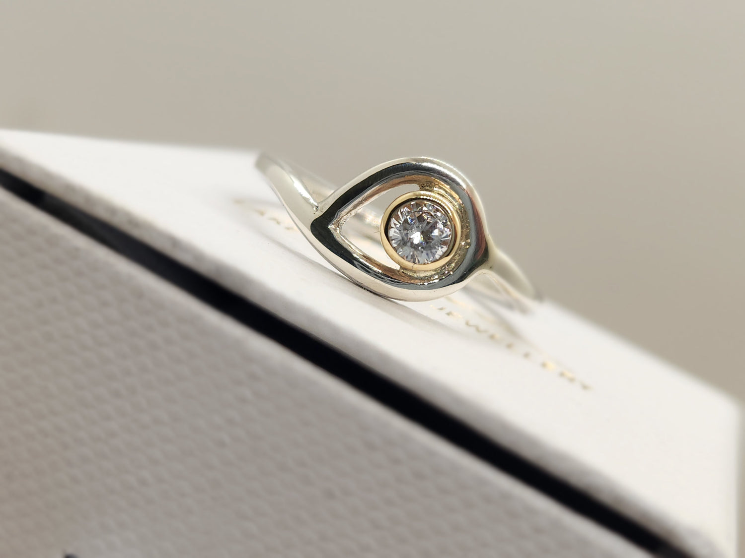 A beautiful infinity silver ring set with a diamond in a yellow gold setting